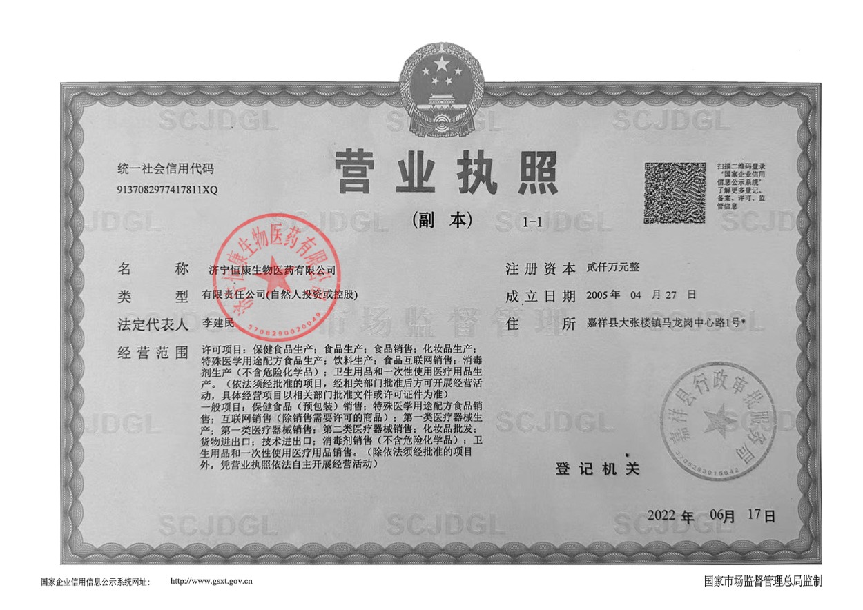 濟(jì)寧恒康生物醫(yī)藥有限公司位于京杭大運(yùn)河之畔、中國古代偉大思想家、教育家孔子的故鄉(xiāng)-濟(jì)寧,是一家集科研、生產(chǎn)、銷售于一體的健康產(chǎn)業(yè)公司。