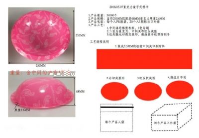 1.產品數量:30000個 2.產品重量:重量:含中間的夾布177克 3.產品規格:直徑255mmx深度68mm亞克力厚度2.6mm 4.產品包裝:每個入pe膠袋,20個入1膠粘出口外箱 5.產品工藝: 1.中間滌綸棉質布料,1色印刷 2.二面為亞克力,中間夾布吹壓成型 3.邊角激光切割成圓形,燃燒盆子邊預防刮手